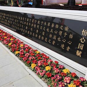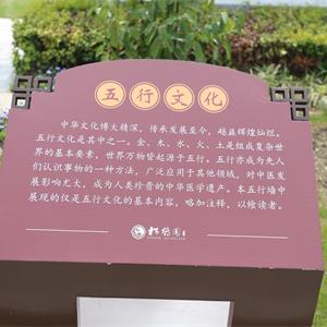 “怡心园”是以中华传统五行养生文化为核心设计的主题园区。内有以“金、木、水、火、土”五根石柱组成的“五行文化广场”;有以“地雕”的方式,展示古代神医华佗倡导的“虎戏、鹿戏、熊戏、猿戏、鸟戏”五禽戏的五行养身步道;用影雕或线雕方式制作的石壁,一面有着字字金光的《怡心园赋》,一面有着《松鹤五行养生画卷》。